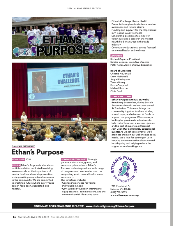 This Holiday Season, Ethan’s Purpose is participating in a 10-day online fund-raising challenge sponsored by Cincinnati Magazine where local charities compete to raise the highest donations. The Cincinnati Gives campaign runs from December 1-11th and the top teams will be rewarded with cash prizes from Cincinnati Magazine. This year, a total of $35,000 is being awarded to the participating nonprofit organizations. Click the link below to paticipate. Together we can make a difference!
